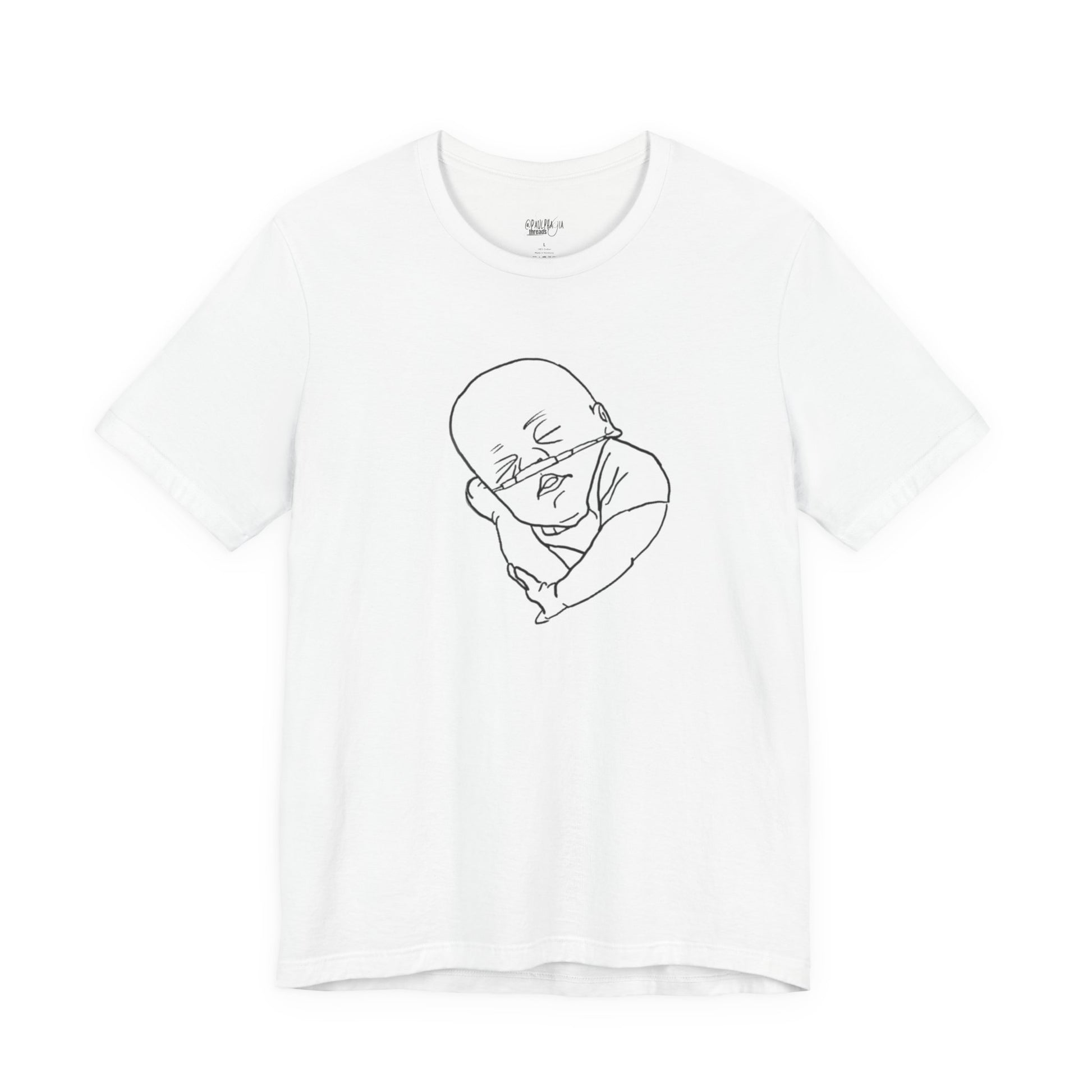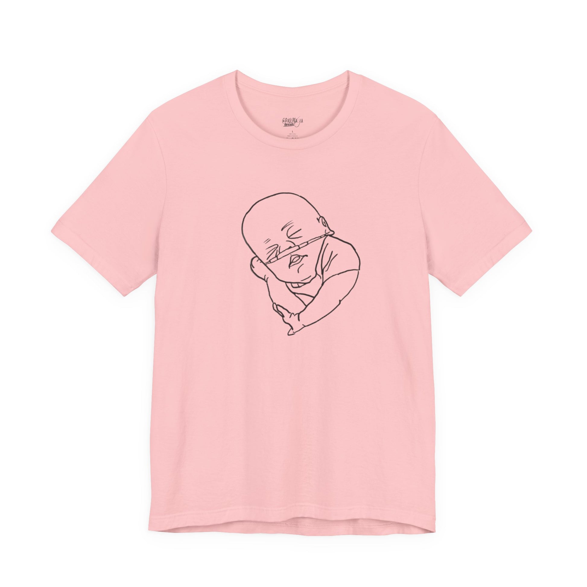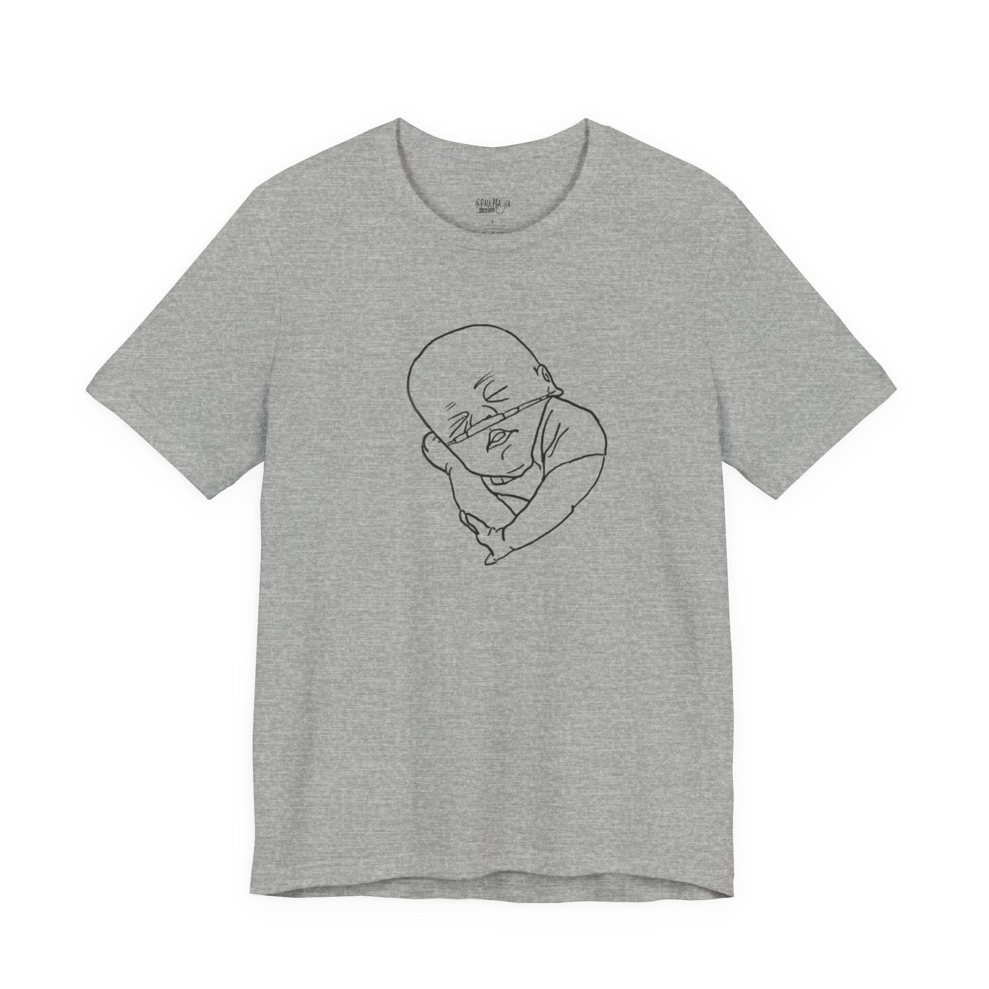 A hand-drawn preemie with O2 support design on a unisex jersey short sleeve tee, perfect for raising awareness for NICU. This tee is made with 100% Airlume combed and ring-spun cotton, providing a lightweight and breathable fabric that's ideal for active and leisure wear. The retail fit and crew neckline make it versatile for casual and semi-formal settings, perfect for accessorizing. This tee is relevant for those passionate about NICU awareness and supporting preemies, fitting seamlessly into their everyday wardrobe and raising awareness during NICU-related observances and events.