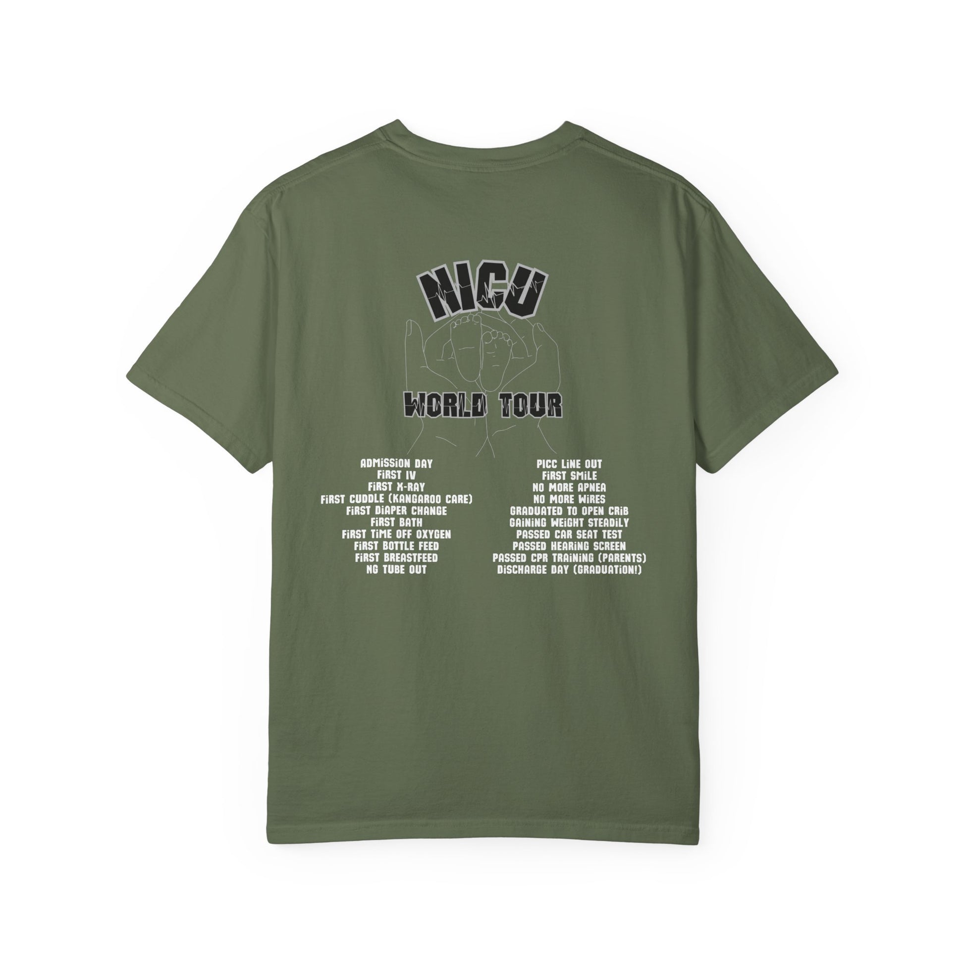 This NICU world tour T-shirt features milestones instead of cities, perfect for parents celebrating their little one's journey. It gives off a sentimental and heartwarming vibe, making it a great gift for parents with preterm babies or those who have spent time in the neonatal intensive care unit. Ideal for baby showers, NICU graduation celebrations, or as a thoughtful gift for NICU nurses.