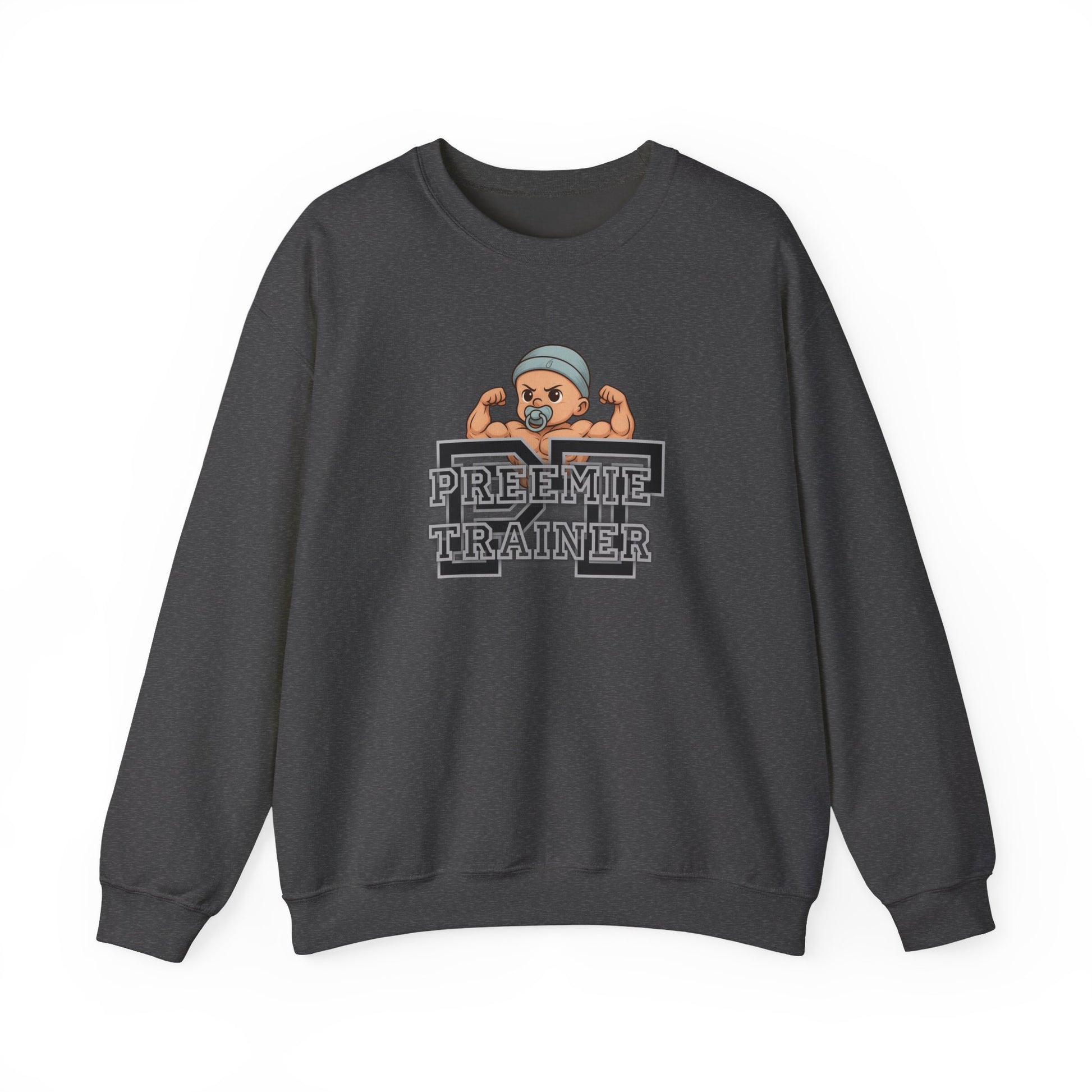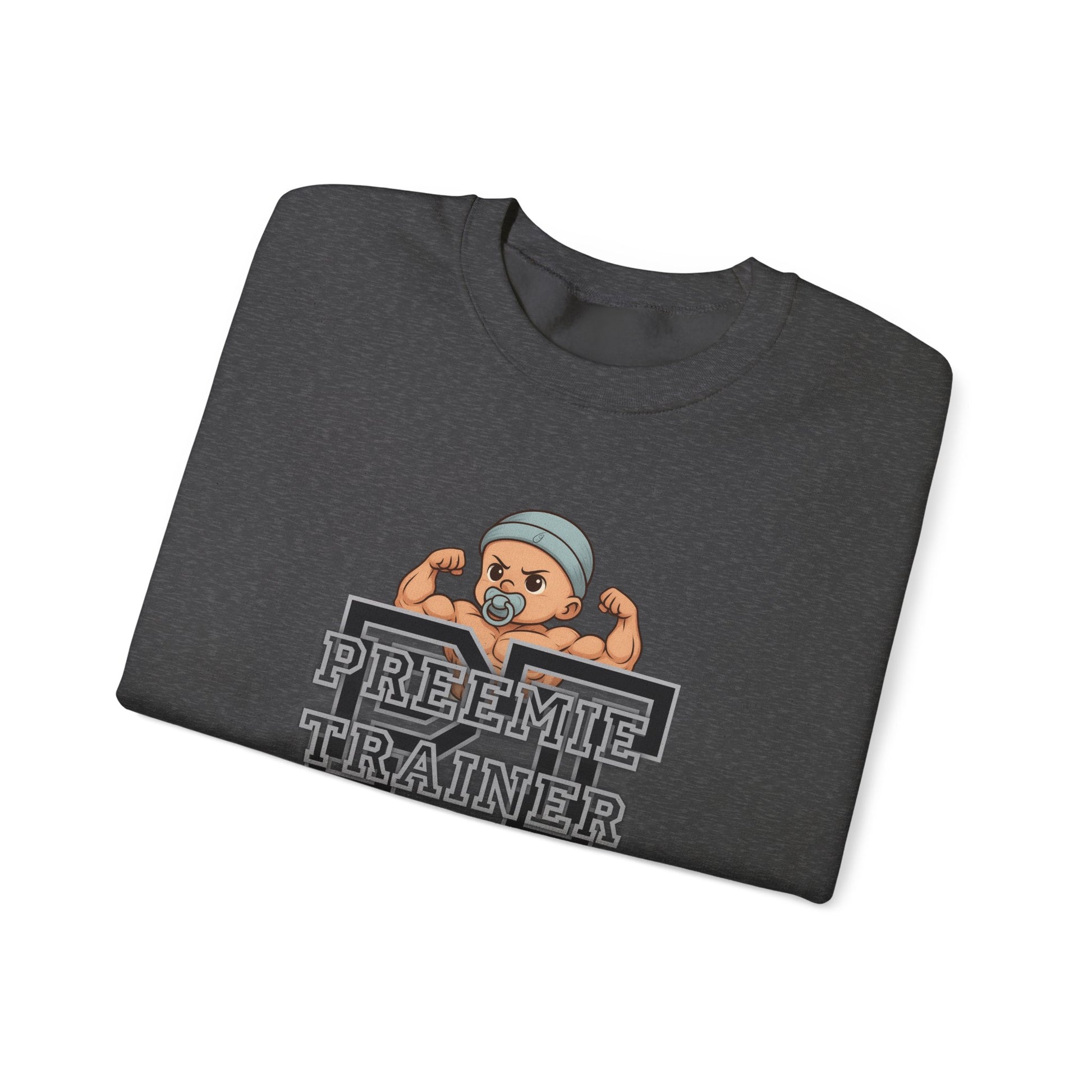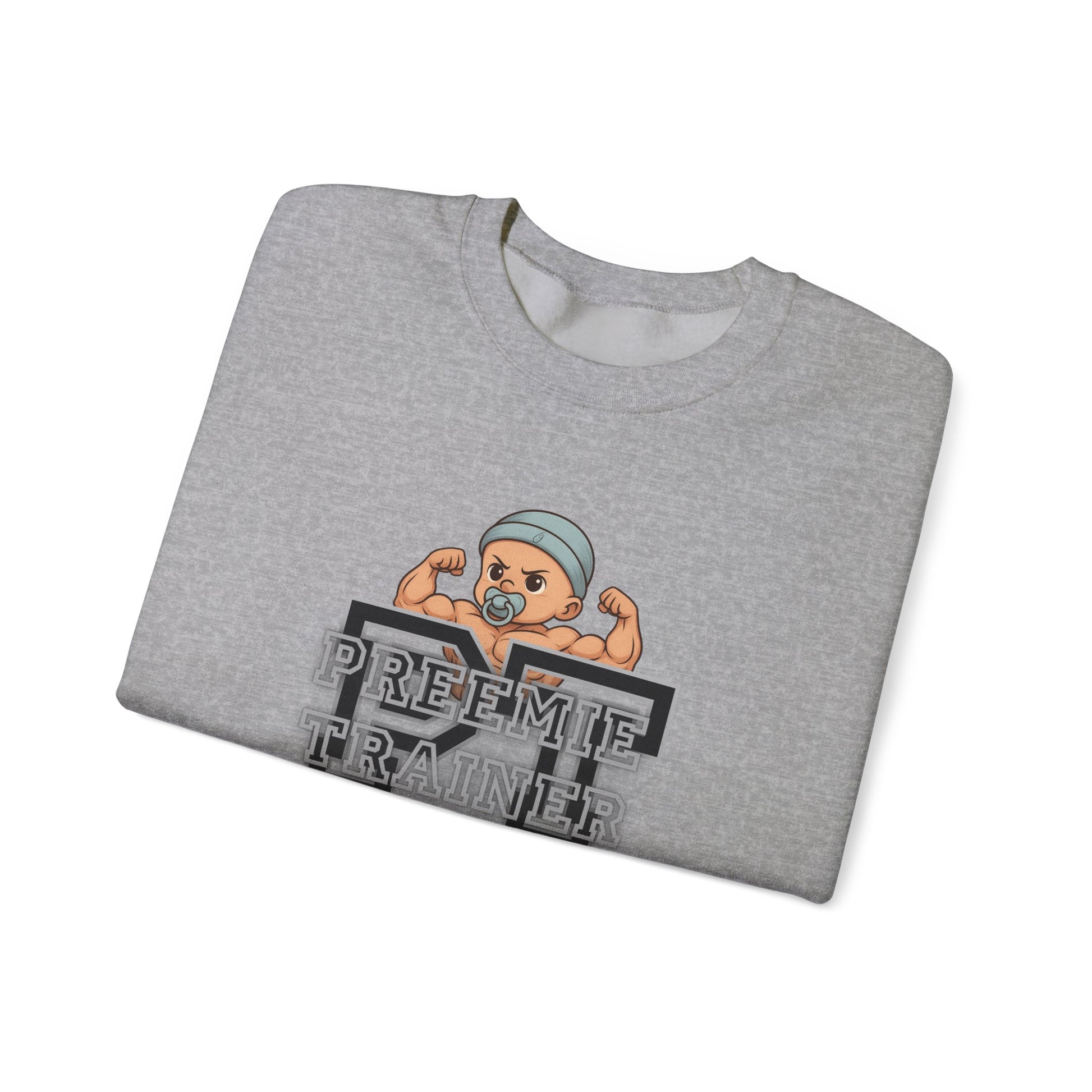 A comfortable and durable unisex crewneck sweatshirt featuring a design with a PT preemie trainer in the NICU and an image of a buff baby. Perfect for adults looking for cozy loungewear with a unique and fun twist. Relevant for NICU nurses, physical therapists, and anyone passionate about preemie care. Ideal for gifting on World Prematurity Day or to celebrate NICU graduates.